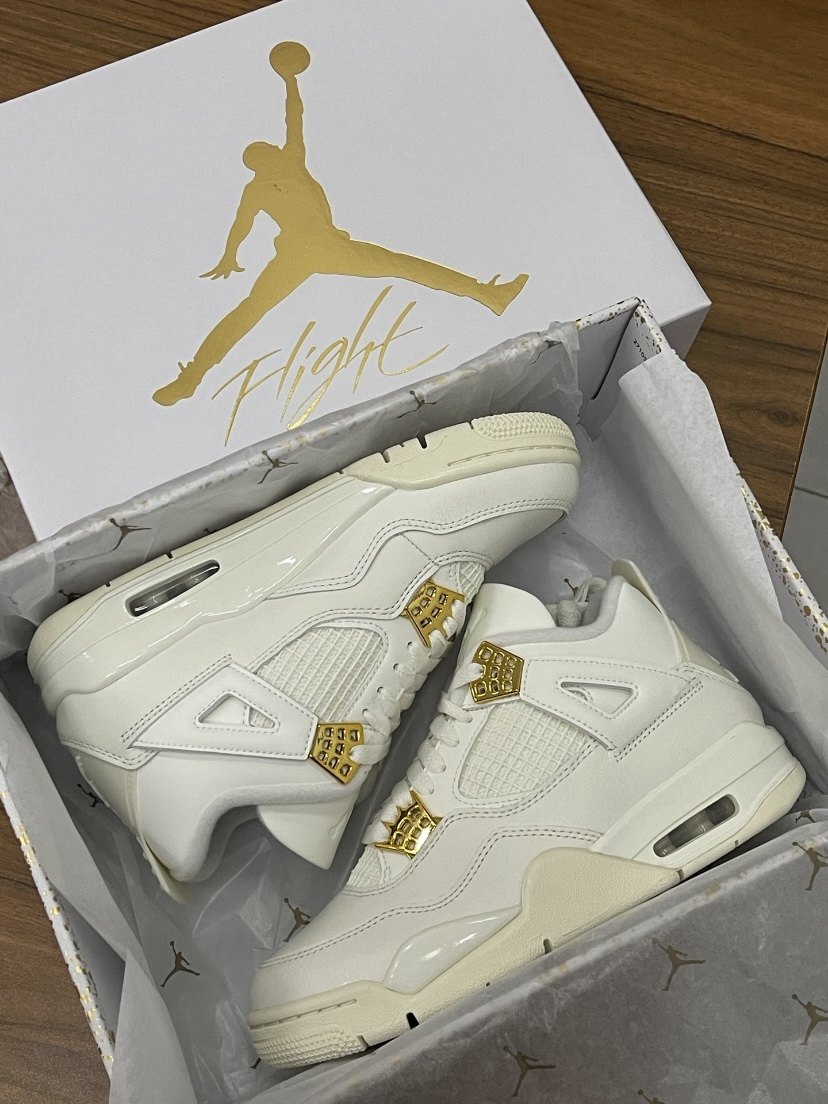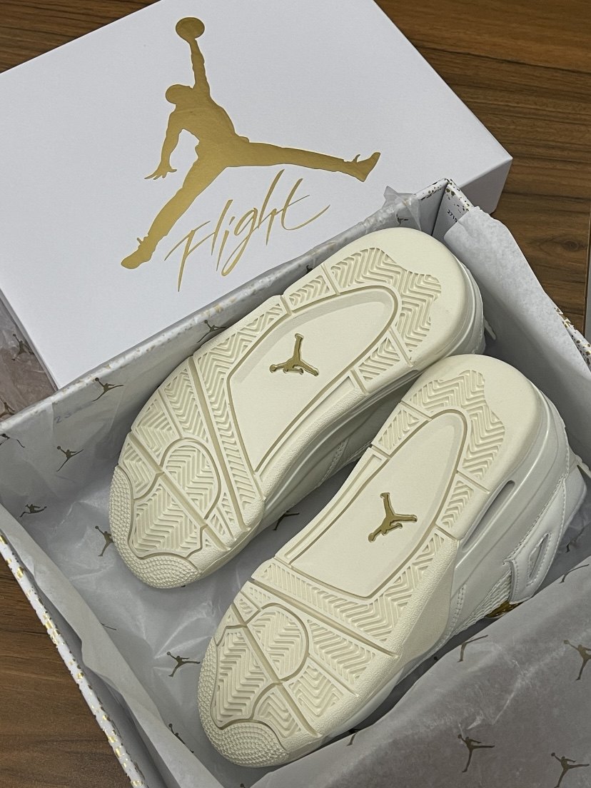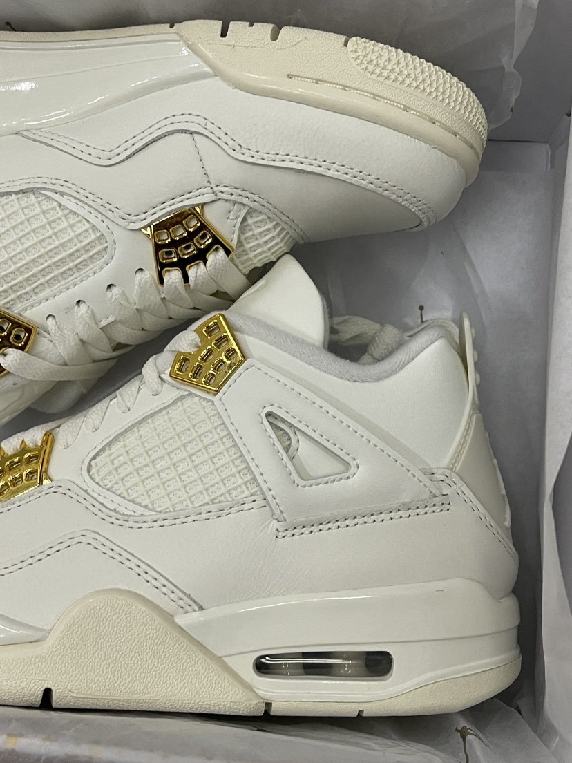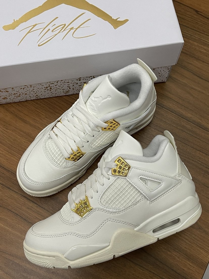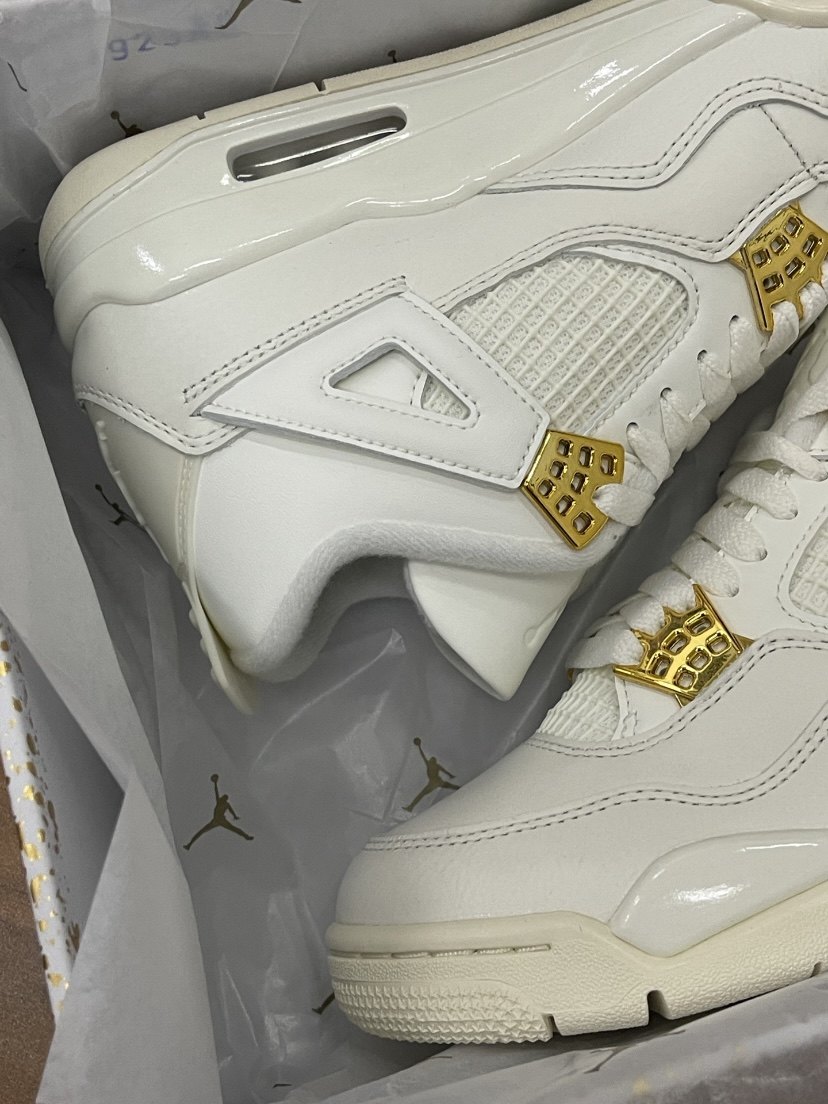 Jordan 1 Air Jordan 4 "Metalic Gold" retro basketball shoes "white" (classic retro AJ4 shoe shape, all-over white textured leather splicing design, old off-white effect on the midsole, embellished with gold on the shoe body
