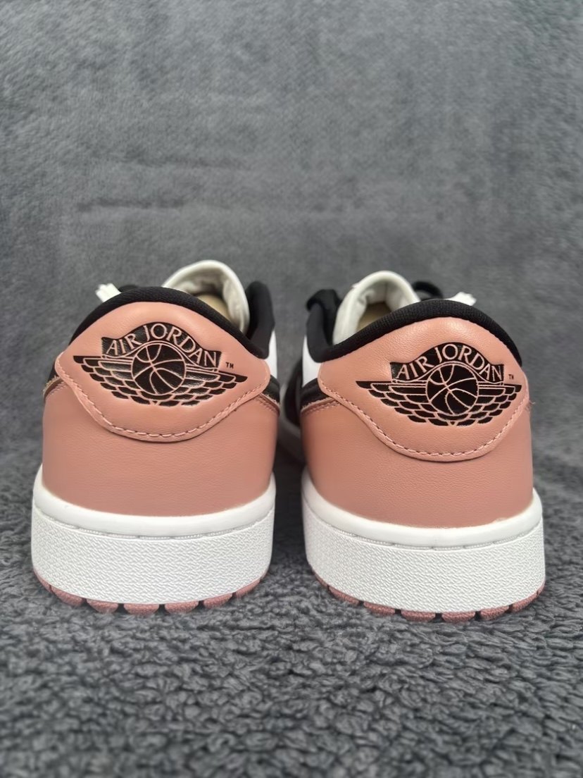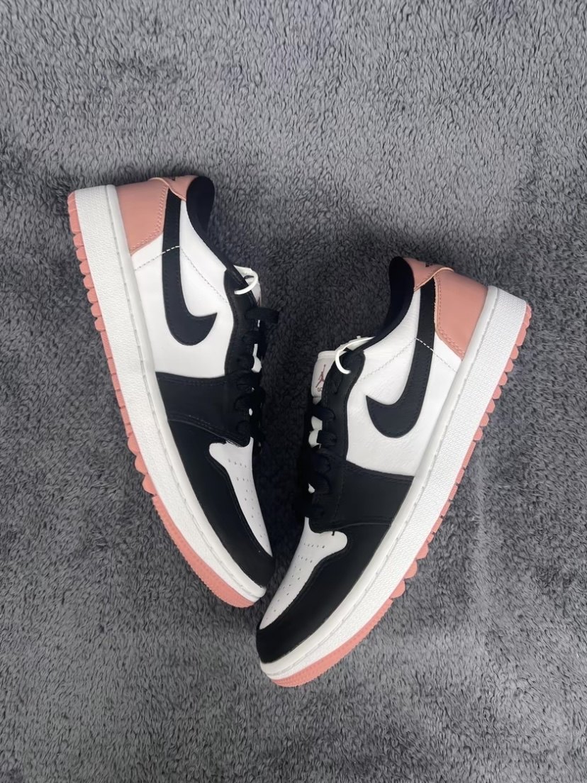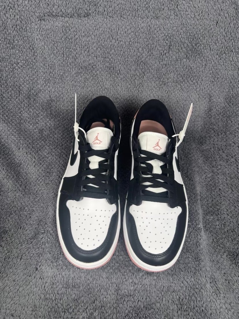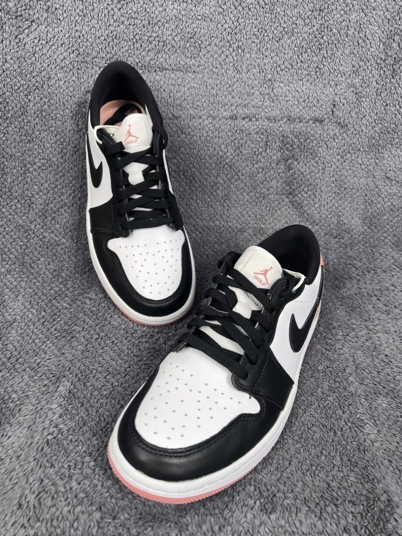pair of aj black and pink golf colors are mainly white on the upper, black on the frame, and pink on the heel. side swoosh