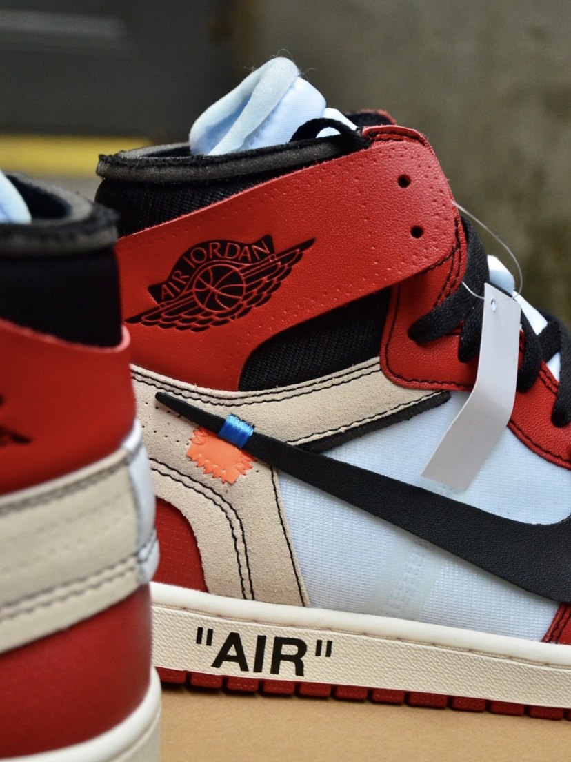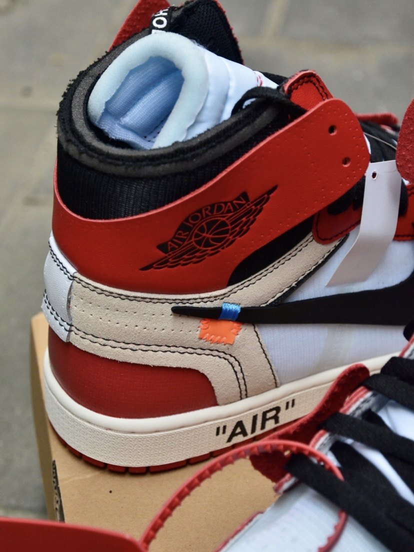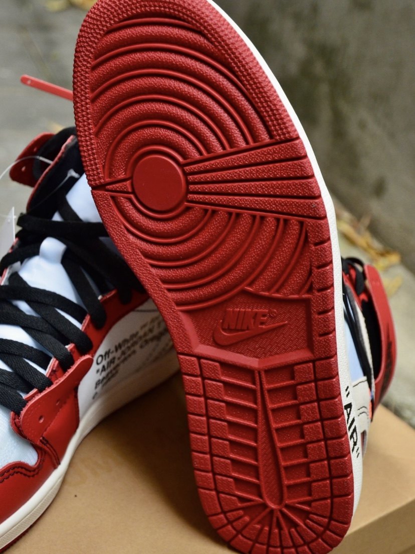 Aj1 is missing a piece of leather and you can clearly see the red line inside.