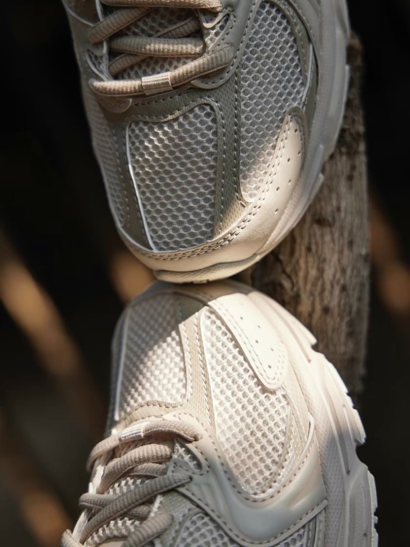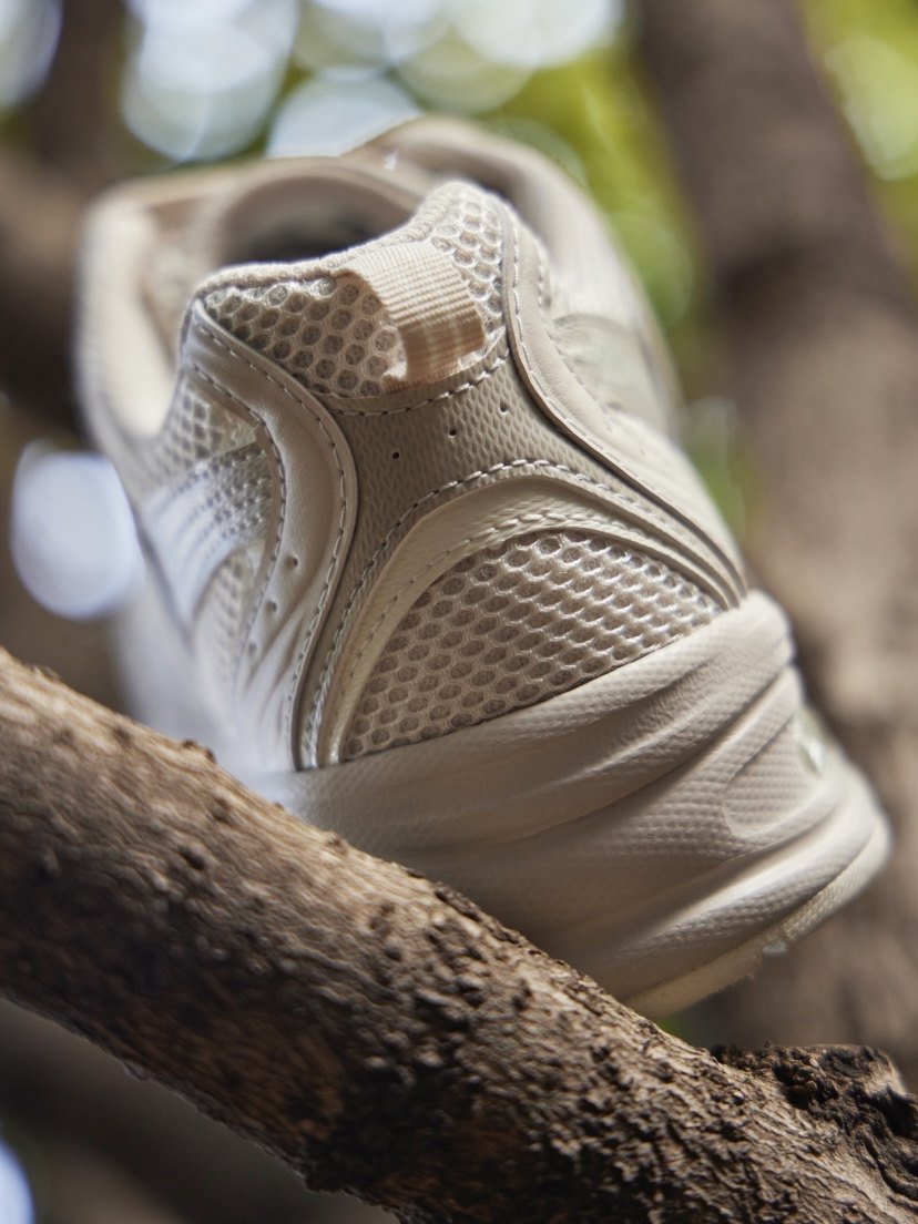 The white mesh shoe body is paired with light brown synthetic metal