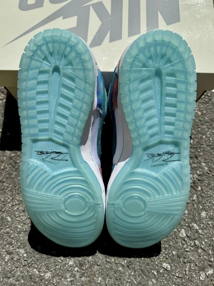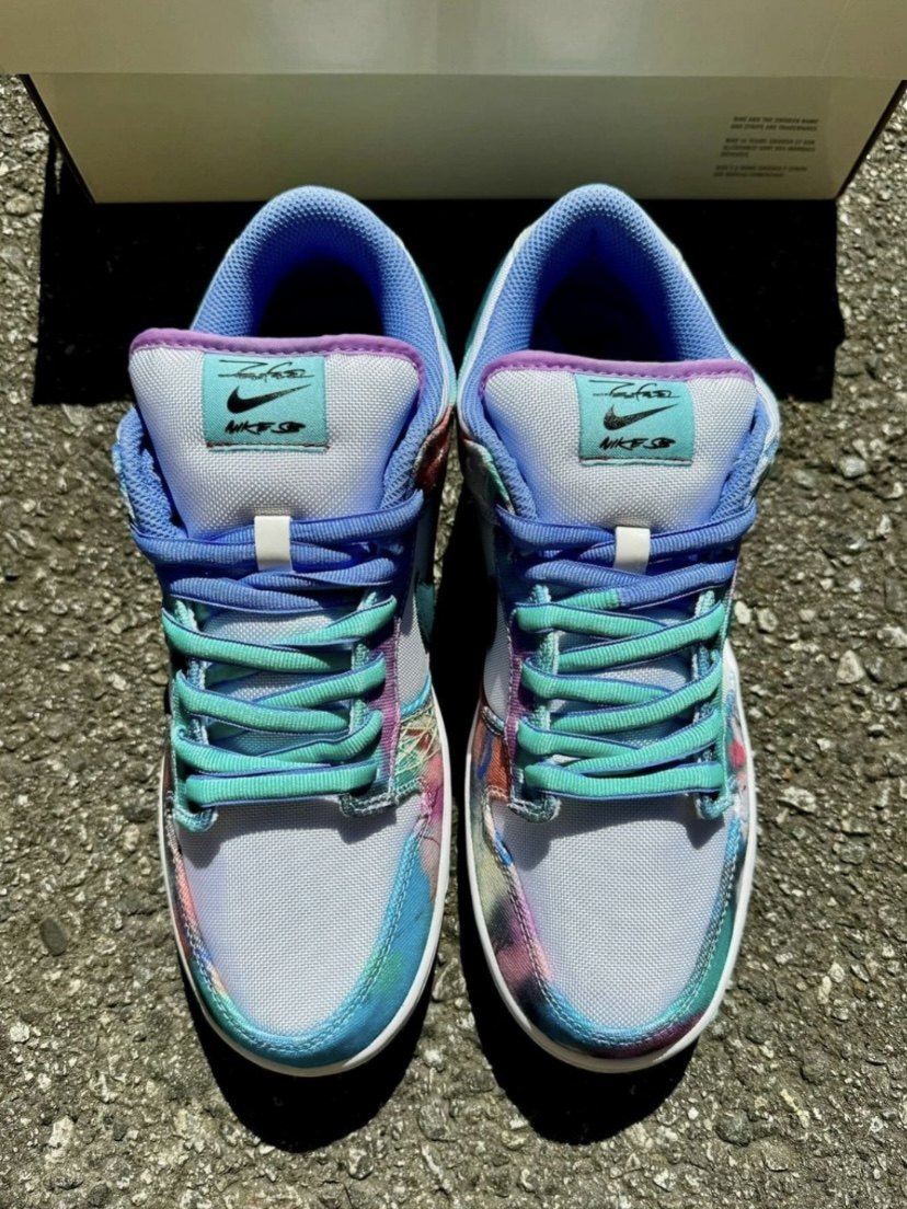 The shoelaces adopt a Tiffany blue/purple gradient design, and the tongue label has Futura signature and Swoosh logo.
