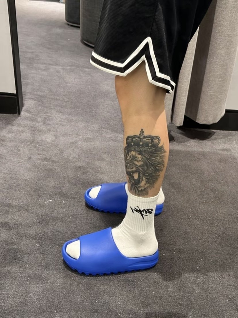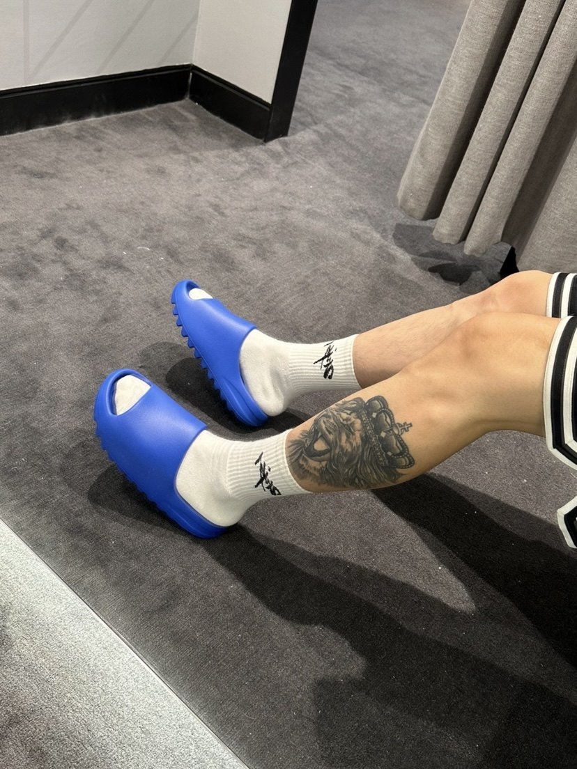 When it comes to comfortable outfits in summer, slippers must be indispensable. It’s super convenient and cool to be out and in in seconds.So today I would like to recommend a good-looking slipper to you, this new Yeezy Slide "Azure" shoe is still made of EVA foam material, the whole is made of dazzling blue, and the color is also very eye-catching. The one-piece design breaks the traditional design style and is highly recognizable and textured. The thick midsole looks durable and has a certain degree of resilience.