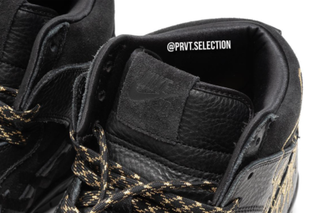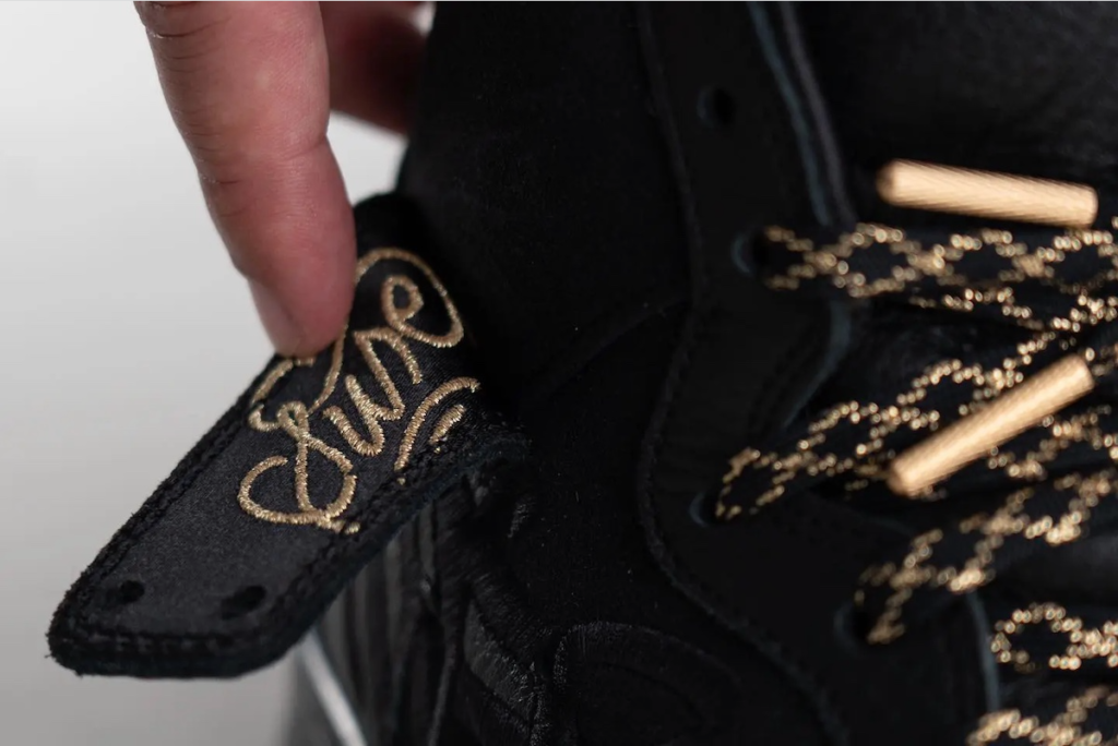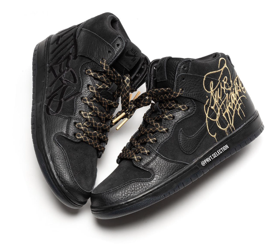 This latest Nike SB Dunk High collaboration is with none other than New York City-based graffiti artist, FAUST. Keeping things clean and classic, the sneaker opts for a Black and Metallic Gold color scheme. Our first look shows a Black suede base paired up with matching tumbled leather overlays that also happen to be detailed with contrasting and tonal embroidery on the lateral and medial sides. Taking a closer look you will find branded insoles that read “Sell Your Soul” as well as “Sell Your Sole”, three lace options, and lace tips debossed with froSkate graphics – which leads us to believe that this sample could be a three-way collab. Gold embroidery on the collar flaps and a Black rubber sole complete the look.