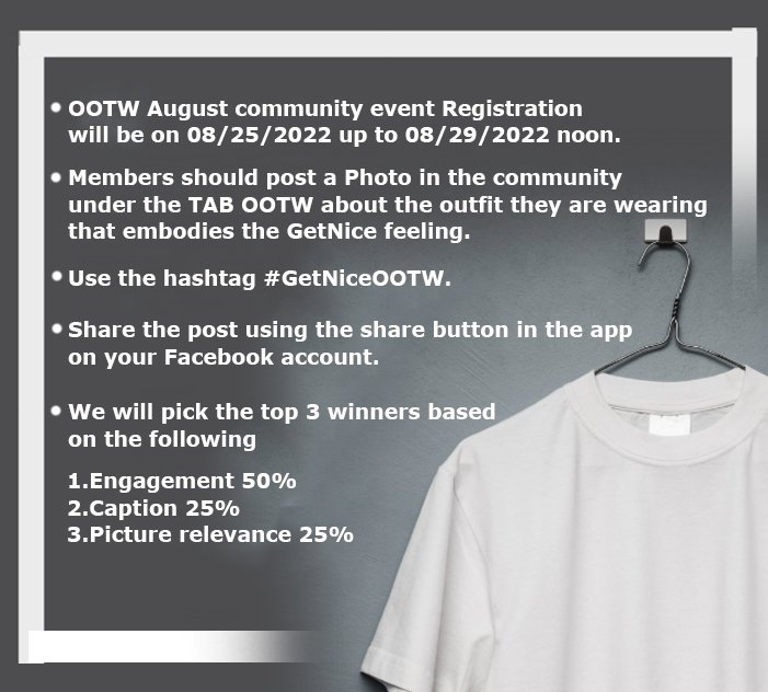 Members should post a Photo in the community under the TAB OOTW about the outfit they are wearing that embodies the GetNice feeling. We want you guys to be as creative as you can so you can use any caption you want as long as its G rated and explain why you choose that outfit then use the hashtag #GetNiceOOTW