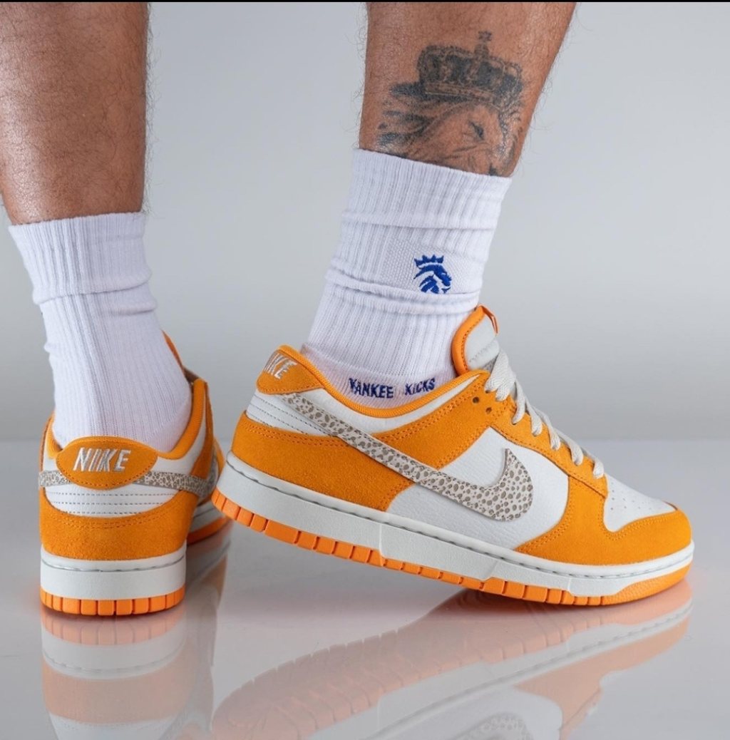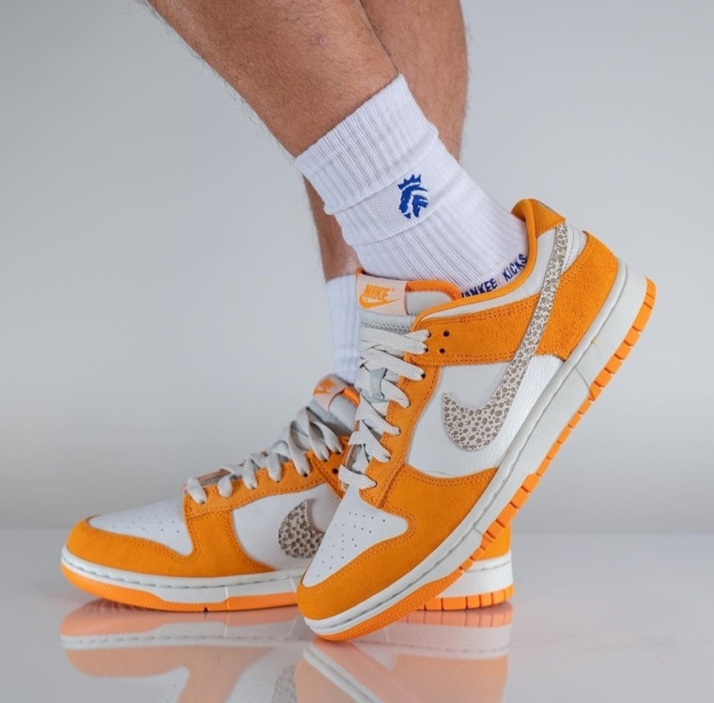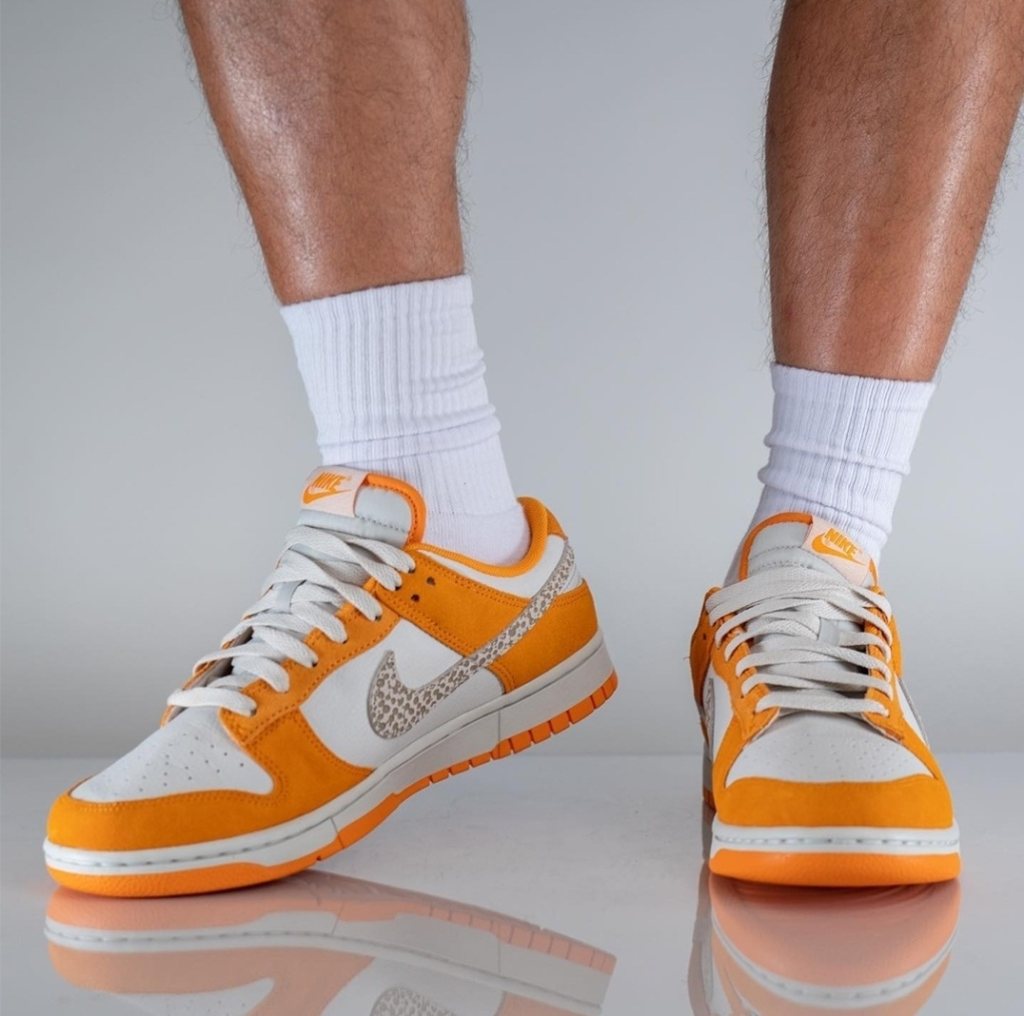 On-foot look at the brandnew Nike Dunk Low. Arriving with a white leather base and suede overlays in a sharp orange hue, with an animal print on the panel swooshes. Releasing 3rd / 4th Quarter of the year.