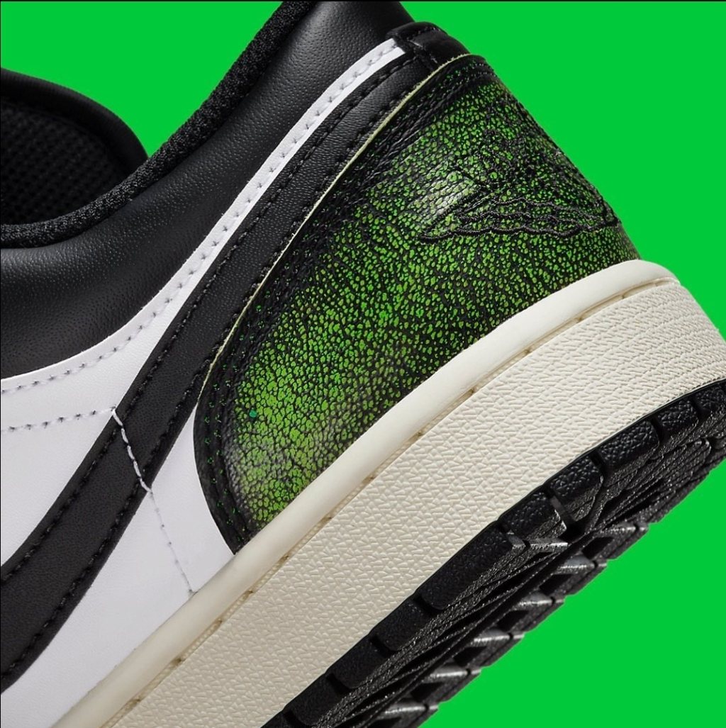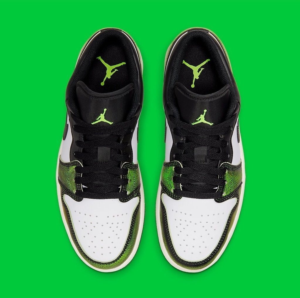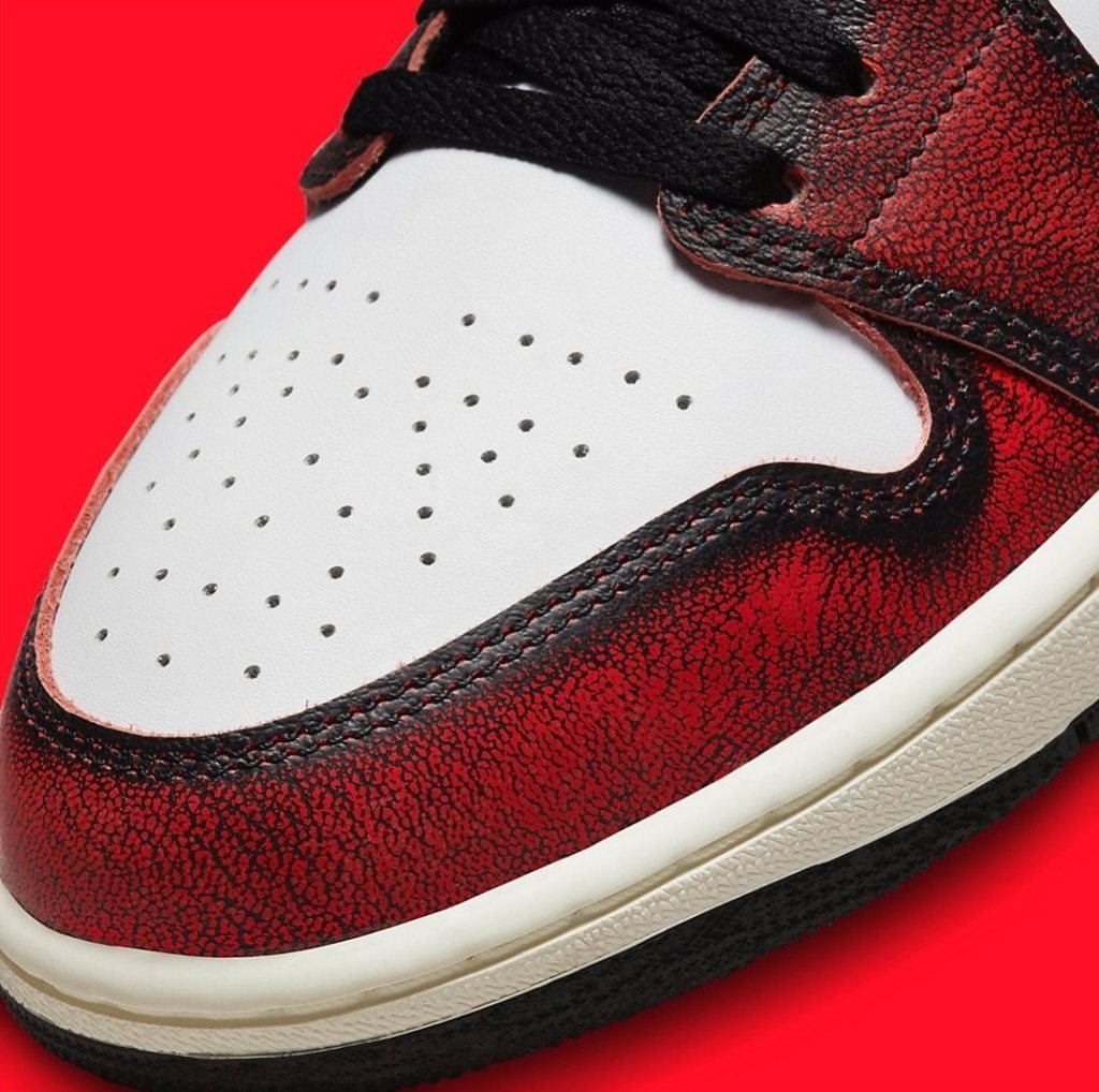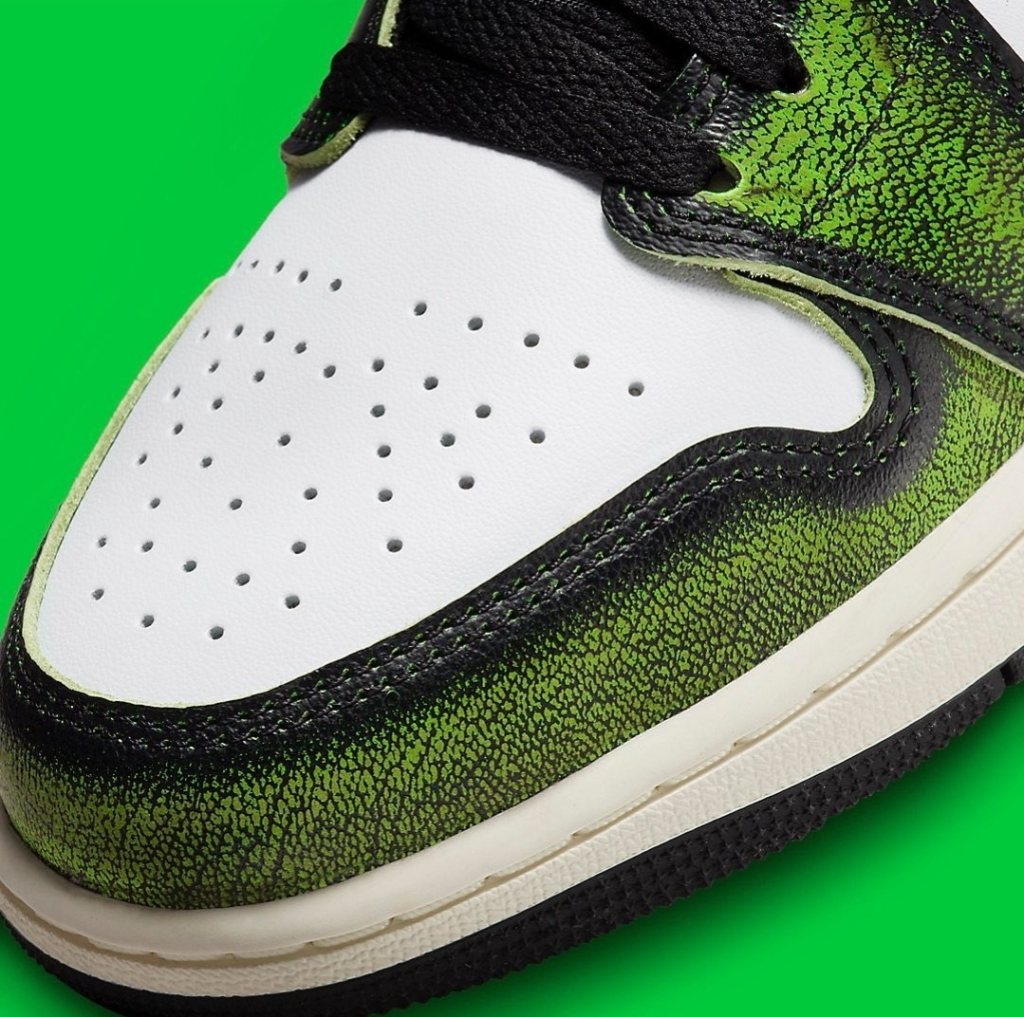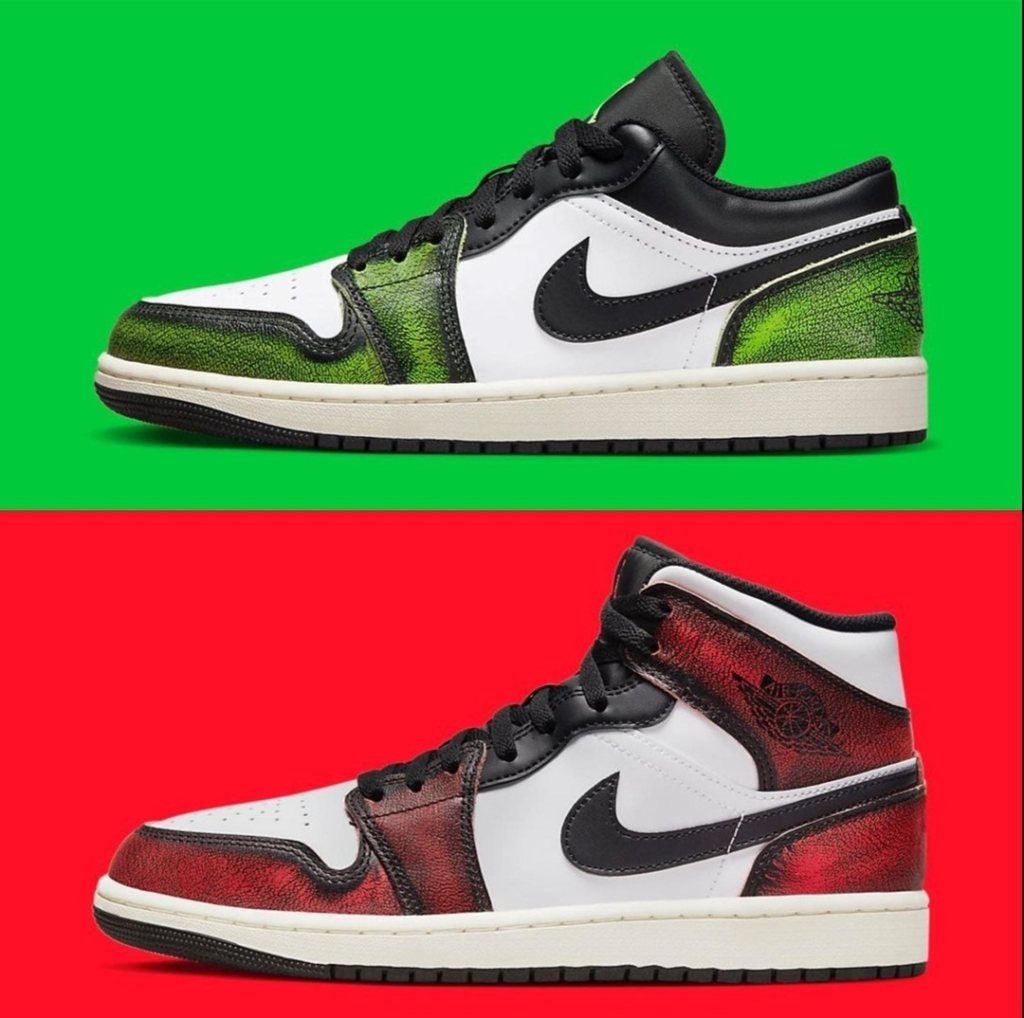 The Air Jordan 1 "Wear Away" features clean white leather uppers accented by black overlays that reveal a contrasting Red and Green tone. Further detailing comes in a form of red jumpman embroidery at the tongues, wings motifs at the collar region (Mid) and printed insoles. Finishing the design of the shoe are off white tone midsoles and black rubber outsoles.